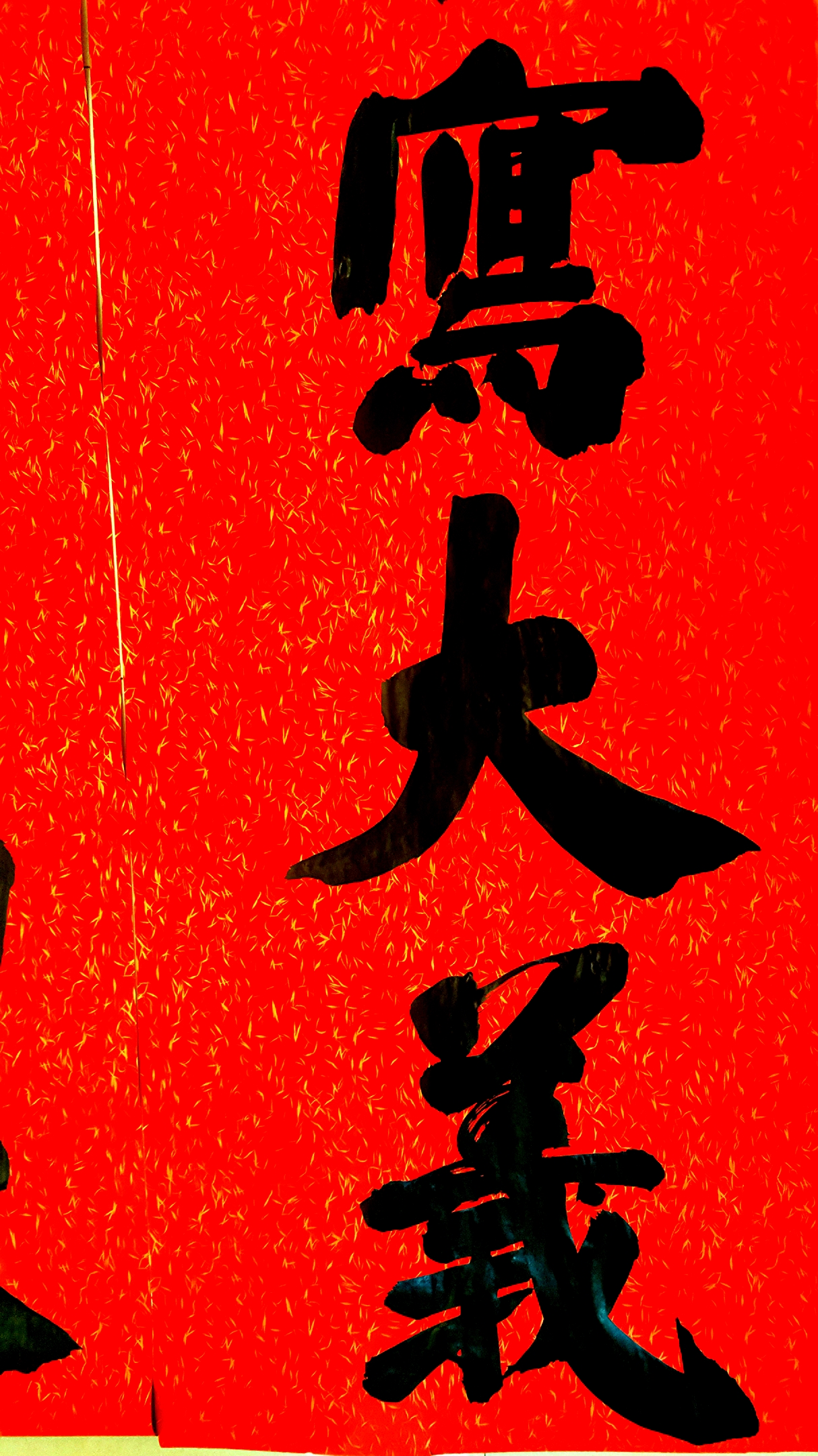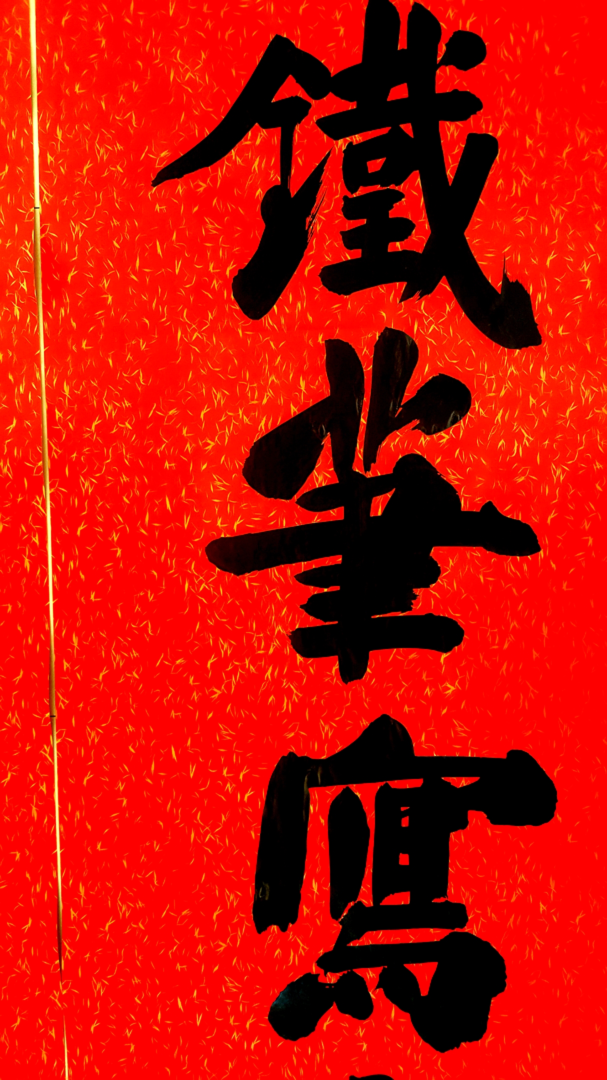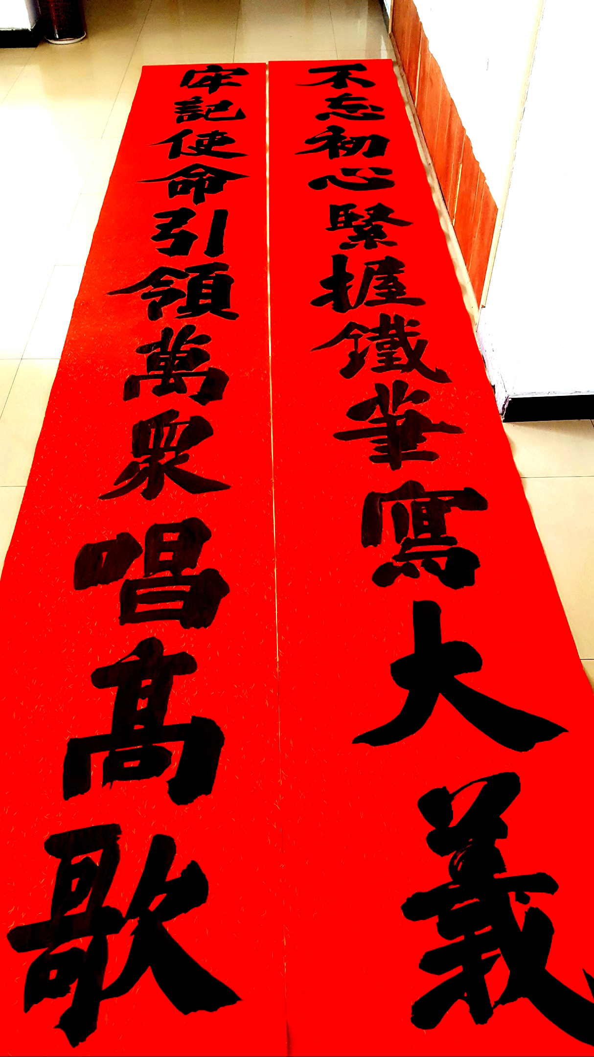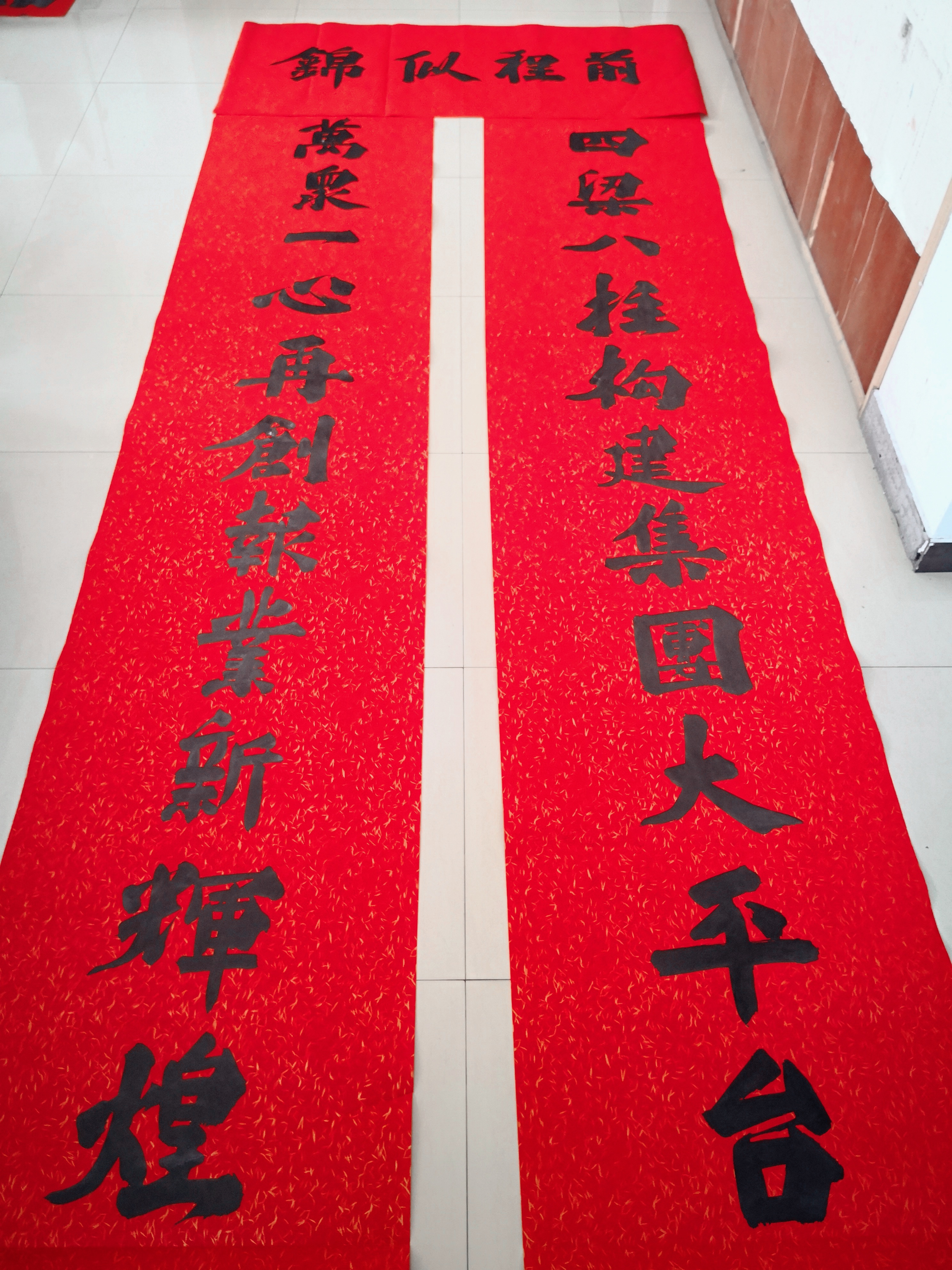 邢懷章以歐陽通筆法融合魏碑,大楷榜書創(chuàng)作而成,春聯(lián)長達(dá)5米,每字徑80公分左右,一氣呵成,不計工拙,近兩個小時完成兩幅巨型春聯(lián),表達(dá)了對周口報業(yè)集團的祝福,映出了喜慶的年味。