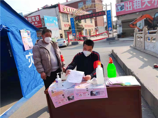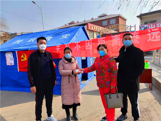 防疫物資緊缺是開展防疫工作面臨的共同難題。王七峰在防疫工作開始后,第一時間向城南辦事處捐助資金5萬元,并發(fā)動親屬積極捐款,其三哥王永紅捐助資金2萬元支持城南辦事處疫情防控工作,14歲的侄子王璽博也將自己的5000元壓歲錢捐了出來,為抗擊疫情助力。之后,王七峰除了統(tǒng)籌村里的防疫工作外,每天早上6點,還會準(zhǔn)時到村里各個防控點或巡查或值守,始終堅守在排查登記、區(qū)域防控第一線。有了王七峰的帶頭表率,該村的干部、黨員、志愿者紛紛加入抗疫隊伍中來,村民們也是有錢出錢、有力出力,大家眾志成城,有效落實了聯(lián)防聯(lián)控、群防群治的各項措施。