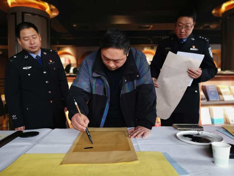1月10日下午,沽讀書廊二樓翰墨飄香、筆鋒頓挫。為慶祝首個(gè)中國警察節(jié),書法家李為、何巖、陳濤、游富華、何祥峰、李雯云、軒敬賢以及祁庚鑫等一行,為川匯區(qū)公安分區(qū)民警義寫書法作品,送來一份特殊的節(jié)日禮物。
