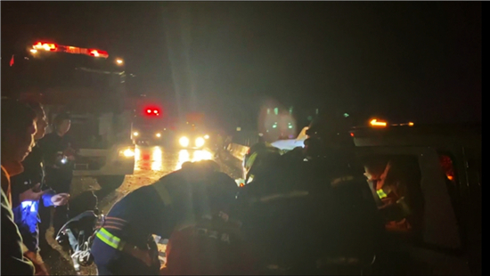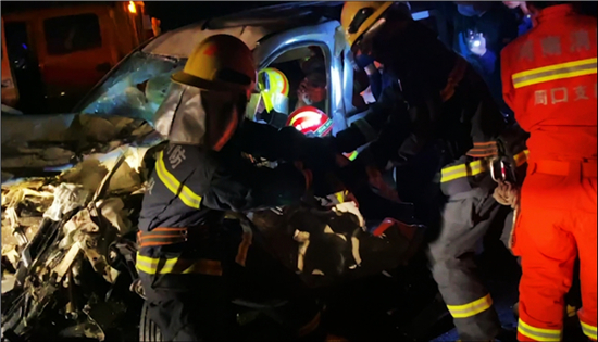 由于面包車內(nèi)有被困人員,需要消防救援人員到達現(xiàn)場使用專業(yè)破拆工具進行救援。示范區(qū)消防大隊接警后立即調(diào)派2部消防車10名指戰(zhàn)員前往現(xiàn)場。指戰(zhàn)員到達現(xiàn)場后利用搶險救援車對事故車輛進行牽引,擴大救援空間以便對被困司機進行施救,同時利用破拆工具將面包車進行破拆便于解救被困小女孩,當(dāng)晚8時39分,兩人被救出并移交于醫(yī)護人員接受進一步治療。③5