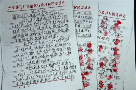 2018年,組織上考慮到韓宇南已經(jīng)在第一書記的崗位上工作了3年多,決定換他回原單位工作。前何村的群眾聽(tīng)到這個(gè)消息后,多次前往馬廠鎮(zhèn)政府請(qǐng)?jiān)福罅粝马n宇南繼續(xù)擔(dān)任前河村支部書記,何心功等99位村民還向國(guó)家稅務(wù)總局周口市稅務(wù)局、太康縣委縣政府寫了一封“挽留信”,并按下了99個(gè)鮮紅的手印。