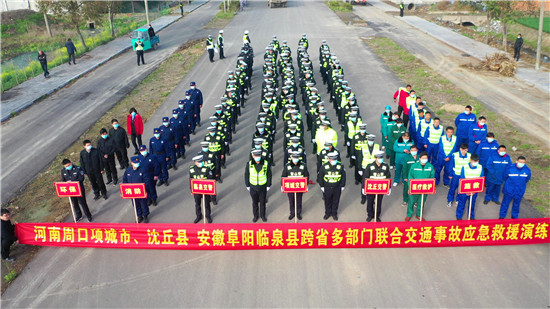 為進(jìn)一步健全完善涉及危險品運(yùn)輸車事故應(yīng)急處置和搶險救援機(jī)制,加強(qiáng)省際國省道安全管控,提高突發(fā)事件應(yīng)急處置和救援能力,經(jīng)共同研究決定,3月3日上午,河南省公安廳交警總隊(duì)組織周口市公安局交通管理支隊(duì)和安徽阜陽市公安局交通管理支隊(duì)聯(lián)合兩地交警、環(huán)保、消防、施救、120急救中心等多部門在兩市交界處舉行道路交通事故應(yīng)急救援聯(lián)合演練,演練內(nèi)容包括接處警、交通管制、環(huán)境監(jiān)測、營救被困人員、處置危化品、事故現(xiàn)場勘察、事故現(xiàn)場清理等內(nèi)容。